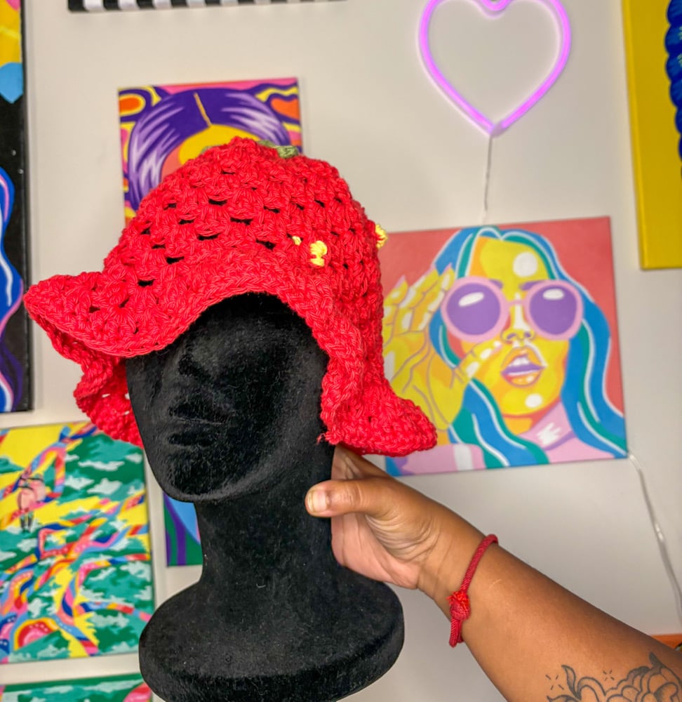 This hat was made with cotton yarn to give the hat a lighter feel in warm weather. It was made to fit the average adult’s head.